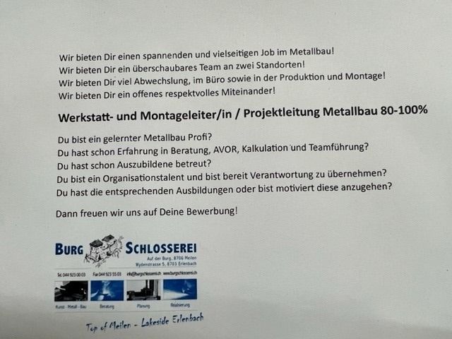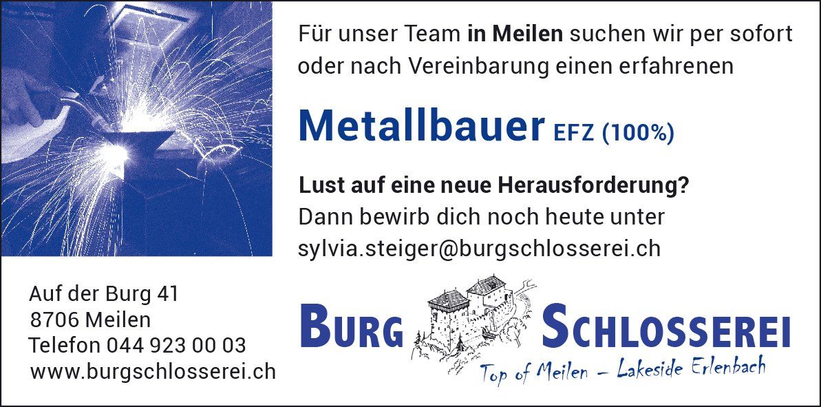 Die Burg-Schlosserei, gegründet 2001 von Thomas Steiger und seiner Partnerin Sylvia Jud, hat 8 Mitarbeiter, darunter 2 Lernende, und ist stolz auf professionelle Arbeit mit viel Liebe zum Detail. Zum Stammbetrieb auf der Burg ob Meilen ist vor einiger Zeit eine zweite Werkstatt in Erlenbach gekommen. «Top of Meilen – Lakeside Erlenbach» lautet deshalb der Werbeslogan der Burg-Schlosserei.